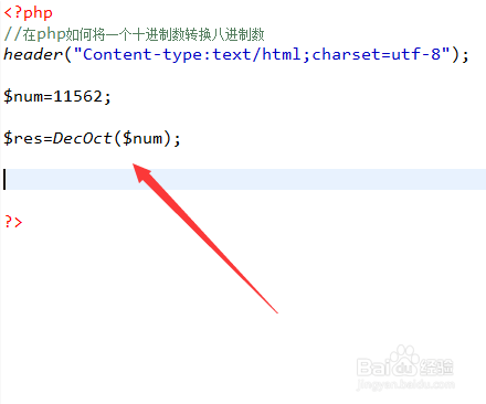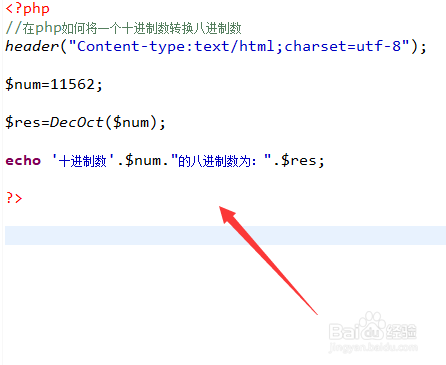 2、经由过程DecOct()函数将$num十进制数转换为八进制数,利用echo输出转换后的成果。