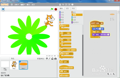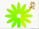 将小猫移到右上角,避免盖住花瓣,按空格键执行程序,我们就画好了一个不竭变色的彩色十二瓣花;