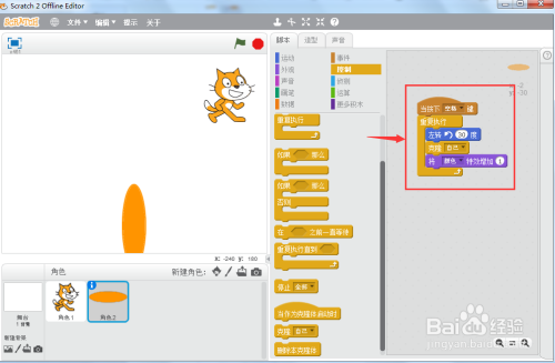 添加如下剧本,注重扭转30度,克隆本身,将颜色特效增添,并反复执行;
