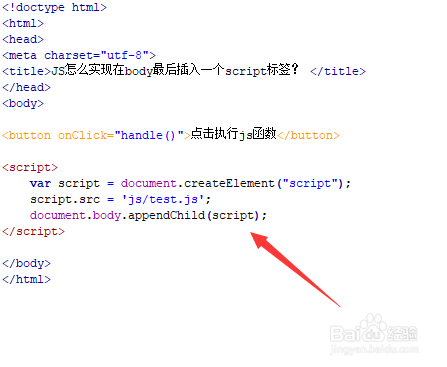 在js标签内,再利用appendChild()方式将建立的script标签在body最后插入。