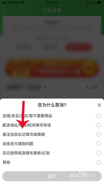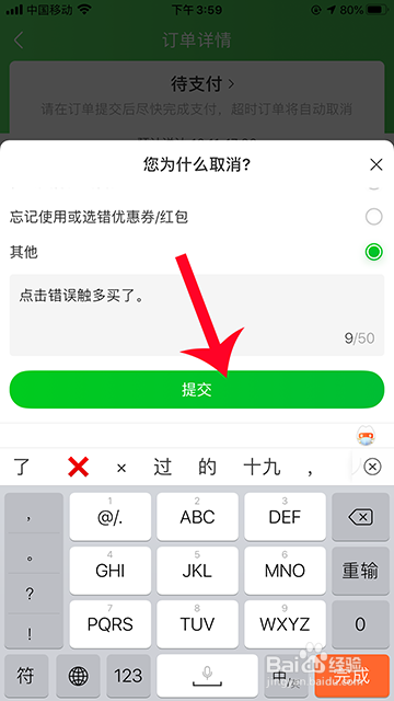 4.将打消订单的原因勾勒上,输入具体原因6字以上,点击“提交”即可。