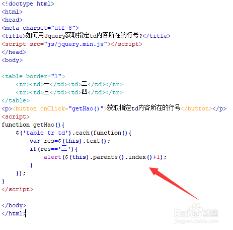 3、在js中,再利用if语句判定td的内容是否为“三”,若是是,则获适当前的td对象,并利用parents()方式获得行对象,再经由过程index()方式获适当前行号,并利用alert()方式输出。