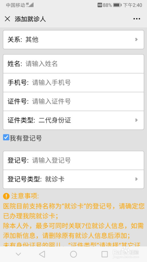 接着就是填写一些小我信息,若是有病院的‘就诊卡’,需要把‘我有挂号号’给勾上。