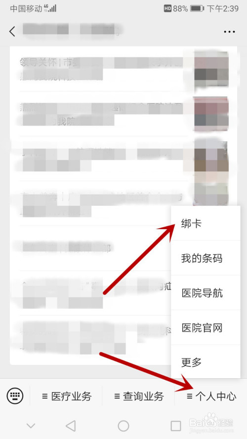 存眷之后会主动跳转到公家号里,然后点击‘小我中间’里的‘绑卡’。