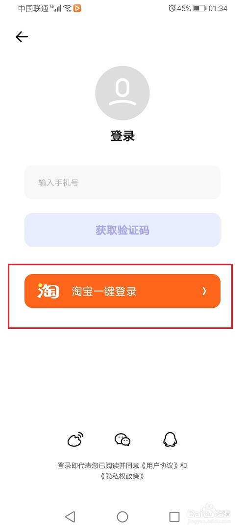 第三步进去登录界面之后,点击淘宝一键登录,如下图所示: