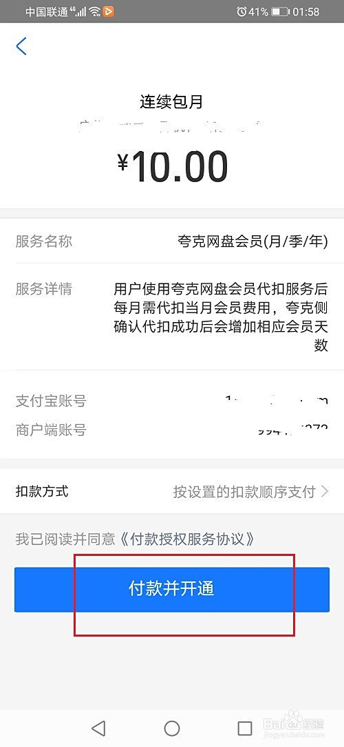 第五步点击付条目并开通,就当作功开通夸克网盘会员了,如下图所示: