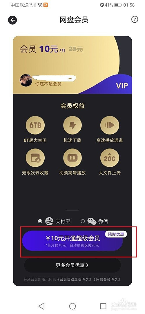第四步进去网盘会员界面之后,点击开通超等会员,如下图所示: