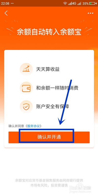进入【余额主动转入余额宝】页面,找到【确认并开通】选项单击即可