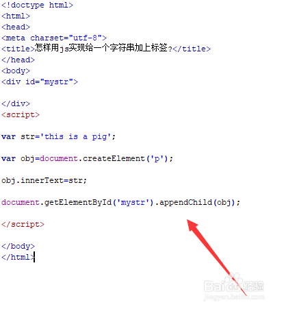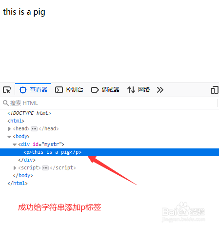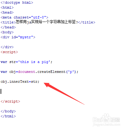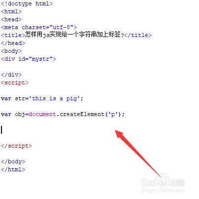 在js标签内,界说一个字符串str,例如,“this is a pig”,并利用createElement()方式建立一个p标签对象。