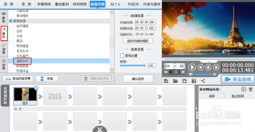 选择美化栏;选择鲜艳色调下的暖和如初,具体要如何的画面气概按照本身的需要来,我们可以看到右侧视频界面会显示该气概的预览结果。
