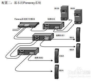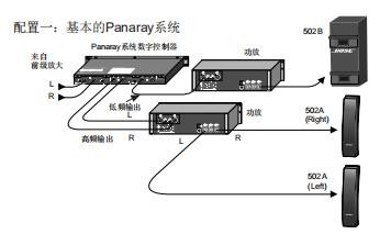 ENDPanaray 502 系统的根基设置装备摆设:由一只 502B、两只 502A 和一台 Panaray 系统数字控 制器构成的三通道立体声放大系统。该系统供给 115dB - SPL@ 1m的平均输作声压,经由过程简单 地将低音音箱安设在大而坚硬的概况上就可获得 更强的低频输出。具体设置装备摆设见下图: