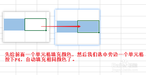 此刻我来说F4功能键的感化。我们在Excel中选中一个单位格并填充上颜色,然后选择旁边一个单位格,按下F4,您会发现主动填充上不异的颜色。