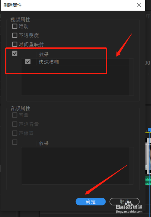 删除属性窗口会呈现多个视频属性,选择需要删除的某个属性,例如勾选“快速恍惚”,点击“确定”,即可删除。