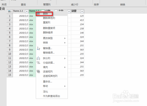 如图为导入到PowerQuery中的数据,起首,可以删除多个的文件名称后缀列,具体如图所示: