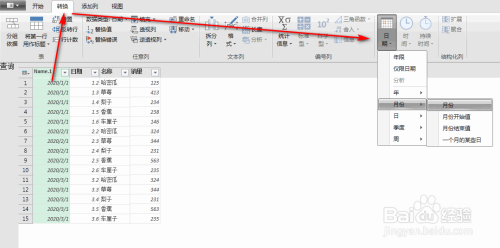 接着选中要处置的列,在“转换”选项卡下点击“日期”,然后点击“月份”,具体如图所示: