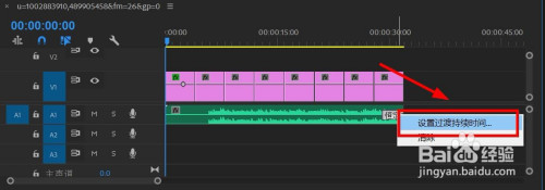 点击选中恒定功率音频过渡。右键点击鼠标。点击“设置过渡持续时候”。