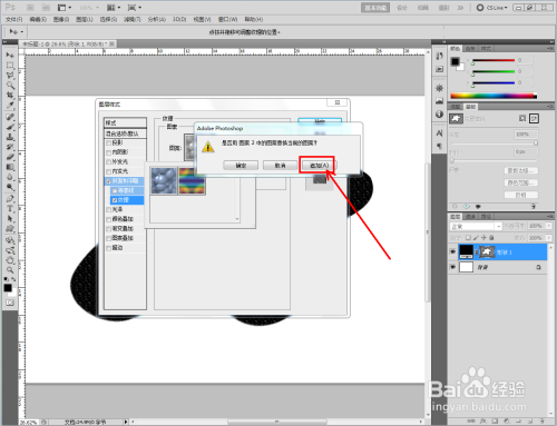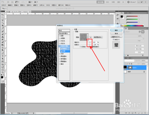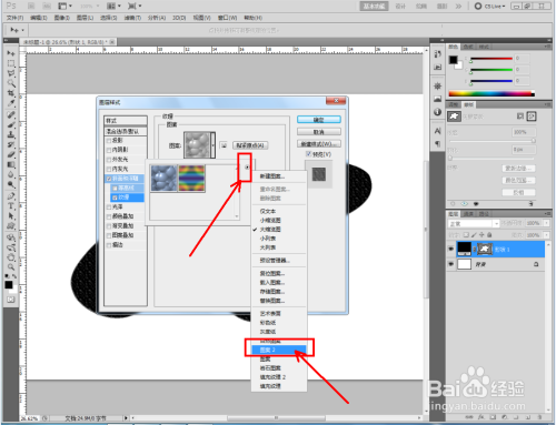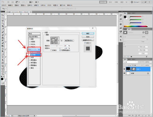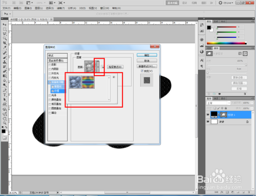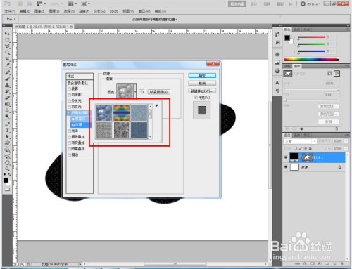 双击图示自界说图案图层,弹出图层样式设置栏。勾选【斜面和浮雕】-【纹理】,点击图示小三角,弹出图案选项栏;