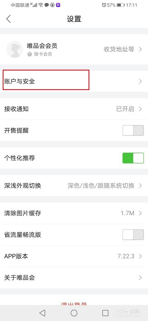第二步进去唯品会设置之后,点击账户与平安,如下图所示: