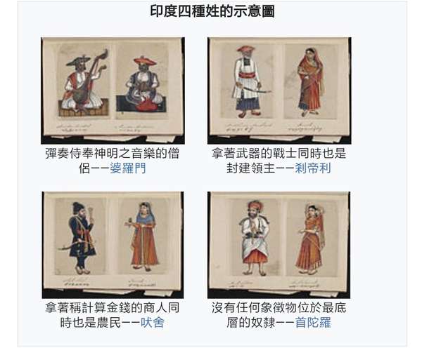 印度种姓轨制源于印度教,又称瓦尔纳轨制,是在后期吠陀时代形当作的,具有 3000 多年汗青。这一轨制将人分为 4 个品级,即婆罗门、刹帝利、吠舍和首陀罗。一张按照《梨俱吠陀·原人歌》所绘的瓦尔那品级:婆罗门是原人的嘴、刹帝利是原人的双臂、吠舍是原人的年夜腿、首陀罗是原人的脚。至于贱平易近,则被解除在原人的身体之外。