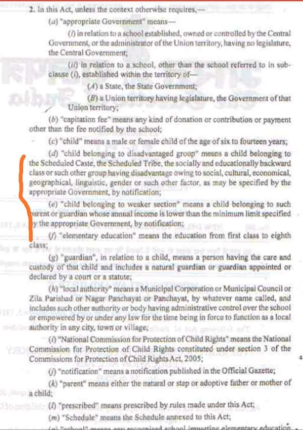 图中标识出的“children belonging to disadvantaged group and weaker section”明白暗示:被相关当局机构列出在社会属性、经济、教育、地舆、说话甚至性别等等处于掉队地位的种姓及部落;怙恃或监护人的年收入属于当局规定低收入群体的。