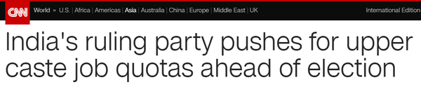 跟着新一届国会选举将在 2019 年 4、5 月份进行,印度的“配额政治”又当作为媒体存眷的话题。据印度报业托拉斯 15 日报道,为落实本月 9 日经由过程的一项宪法批改案,赐与那些未被现有“配额”笼盖的经济弱势群体保留 10%的当局公职和 10%的高校入学名额,印度人力资本开辟部周二颁布发表,从 2019 学年起,印度各高校的招生名额将晋升 25%。所谓“配额”,即指印度为了消弭种姓轨制带来的不服等,由宪律例心猿意马对“掉队阶级”“贫弱人平易近”赐与的特别赐顾帮衬,强制性地在各级议会、当局部分、公共事务部分和讲授机构中为他们预留席位,被称为“预留制”。