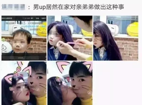 早前 B 站上一个博本家儿,为了红把亲弟弟扮当作伪娘,还和女装的弟弟接吻: