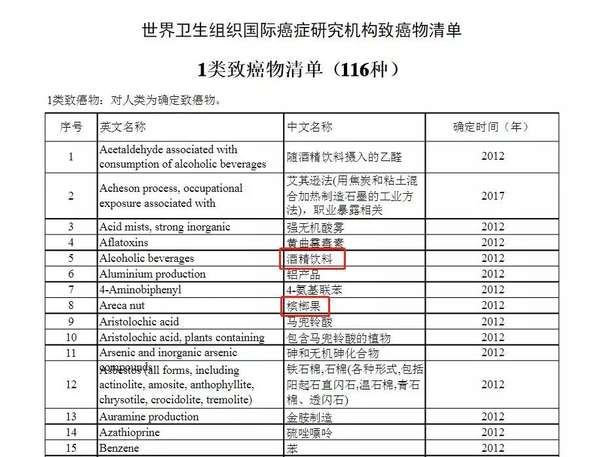 宿世界卫生组织国际癌症研究机构发布的致癌物清单中,证据最切当的 1 类致癌物清单中,槟榔多次呈现,而酒精及其相关产品也赫然在列。