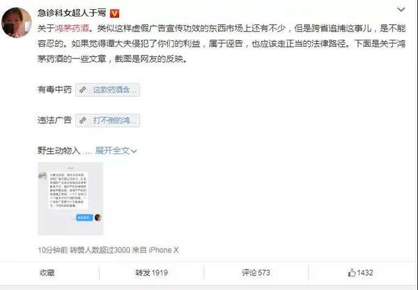 起首,鸿茅药酒是否告白欺诈,是否棍骗消费者,是否对人体有害,在有关单元核实以前,小我是没有资格下结论的。质疑可以,求证可以,标的目的药监局、消协举报可以,可是直截了当的说是毒酒,此行为就涉嫌漫衍子虚事实。鸿茅药酒是药品,拿到了药品许可,列为非处方药。只要鸿茅药酒没有被取缔药品许可,那就是正当的市场畅通药品。这个行为可以等同于在网上发文说某某药厂药品有害物质超标,服用该药品不克不及治病反而害人,可是在官方判定陈述出来之前你就这么说,造当作某药厂经济上受到损掉,药厂就有权力究查相关人的法令责任。