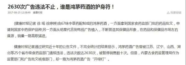 由人平易近日报社本家儿管本家儿办的《健康时报》曾对鸿茅药酒进行过报道( 2017 年 08 月 25 日 第 03 版),颁发了名为《 2630 次告白违法不止,谁是鸿茅药酒的护身符?》的专题文章。