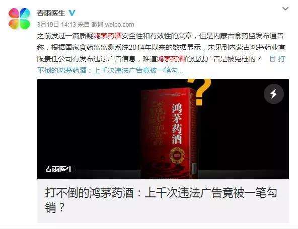 同为医学健康媒体的春雨大夫,在前不久也曾公开辟表过多篇关于鸿茅药酒的文章。