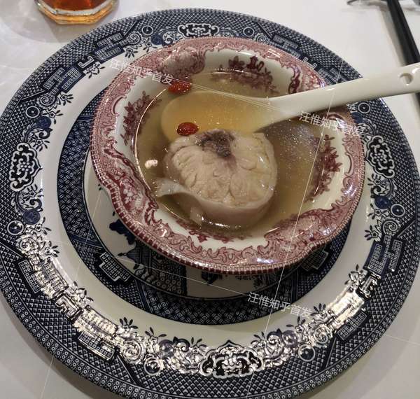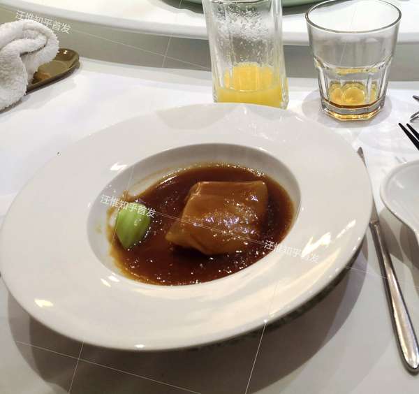 但菜单没说是这是什么鱼的胶,所以原料价钱欠好说。我所知最贵的花胶来自金钱鳌(黄唇鱼),年夜只的金钱鳌曾经卖出过人平易近币 300 多万一条的价钱,而此中最值钱的就是它的鱼泡泡,叫做金钱肚。