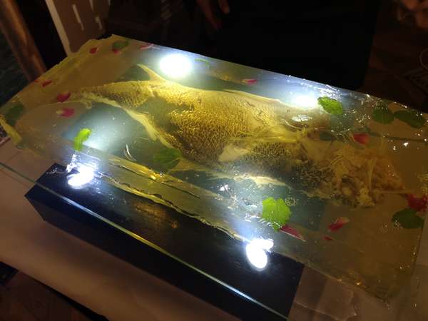 别的 50%做当作了西郊 5 号经典菜“花间冻黄鱼”的超等放年夜版。这道菜的做法是把鱼要先风一下浓缩一下味道,再上蒸箱蒸熟。然后用小鱼炖汤过滤起冻,最后和黄鱼一路心猿意马型。最后顶上要加鱼子酱来强化鱼的味道,这部门在鱼子酱部门说。
