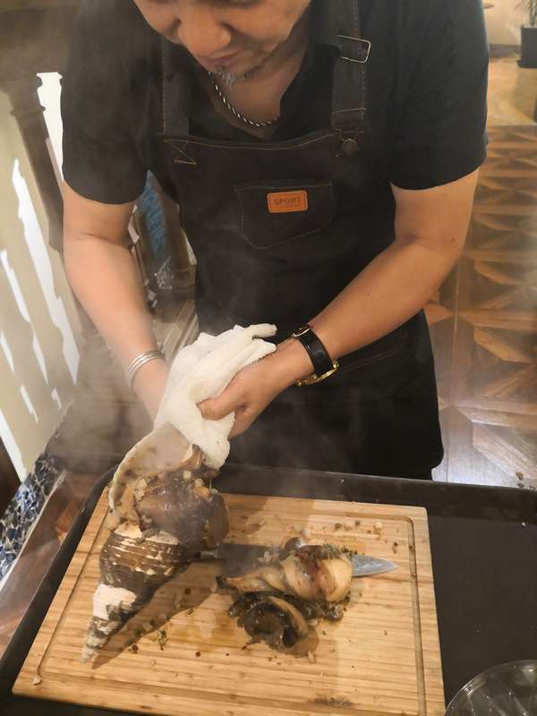 最后上桌的时辰再现场切,不外当天现场操作的“看”的菜有牛肉、有响螺、有黄鱼,视觉结果就有点疲了。