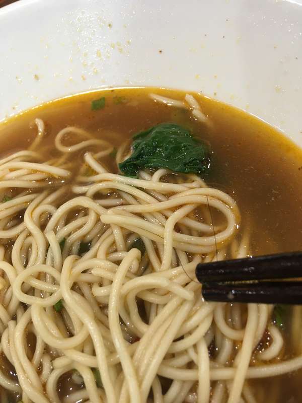 本年七月二号午时在宁波某面馆吃面,发现有一根头发很长的头发比面条还长。