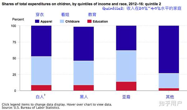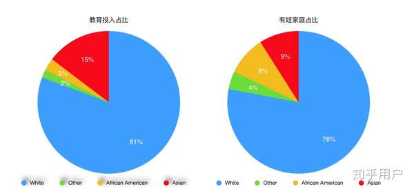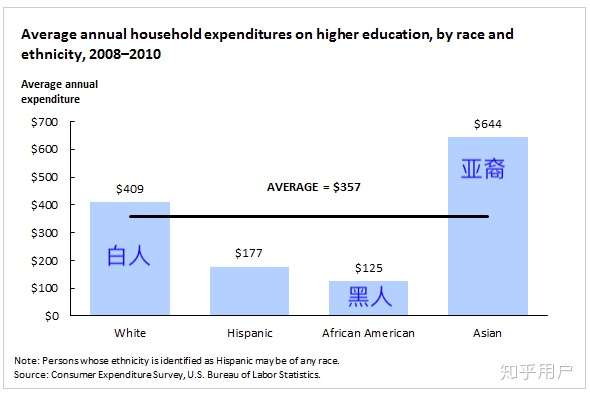 弥补:白人有孩家庭占 78%。 亚洲有孩家庭占比 9%,所以 13%的这个比例是高于其他族裔。 可是:亚裔家庭的教育支出远远高于其他族裔——庞大的教育投入才是亚裔当作为中产的根本。 下图仅仅是各个族裔在膏火上的投入。
