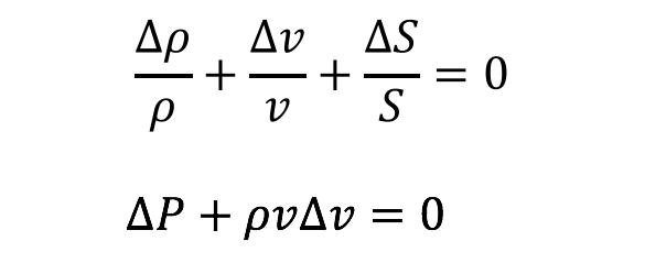 上面两个式子,第一个是质量守恒,即 1 秒内吹进去的空气质量为 m,不管密度速度或者管子横截面积怎么转变,这团气体的质量永远连结 m。