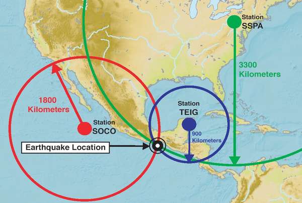 三个分歧地址的数据汇拢,以各个地址为圆心,以各自离震源的距离为半径,地图上画三个圆,三个圆交汇的处所就是震源。