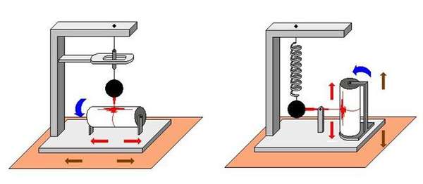 左图是程度地震仪,若是是摆布偏向的震动,底座会跟着地面一路动,吊起来的小球因为惯性,会连结在原位。也就是说,小球和底座之间会发生摆布偏向的相对活动,所以小球底部的笔头会在底座上的的滚动卷纸上留下波形。卷纸的滚动速度恒心猿意马,所以波形的横轴是时候,纵轴是振幅。