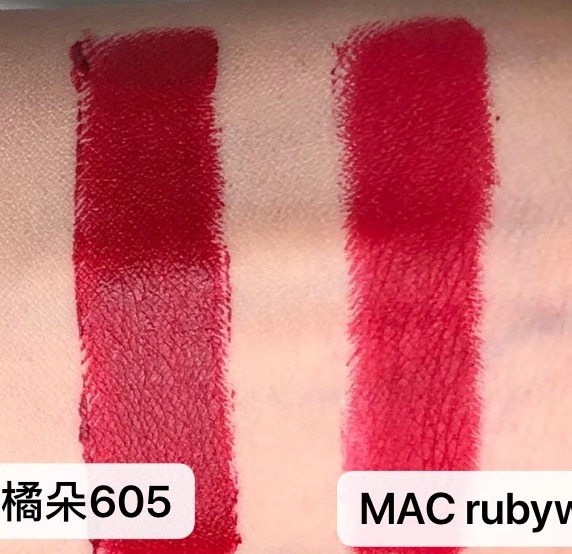 MAC RubyWoo 是经典哑光的复古红,橘朵 605 薄涂方向玫红,厚涂则是和 MAC 完全一样的复古红。二者颜色完美替代,而且都不挑皮。从软妹到御姐都能把握,不挑皮肤,白皮黄皮都很友爱。