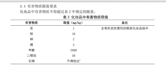 只如果化妆品,都要遵守《化妆品平安手艺规范》。 此中划定了各类有害物质的限值。