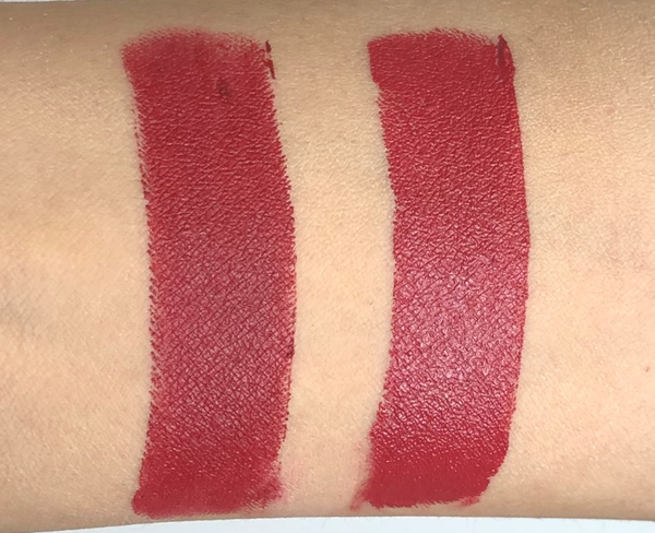 MAC RubyWoo 质地很是干,呈现强烈的哑光感。而 Judydoll 605 较为津润亮光,上色轻易。