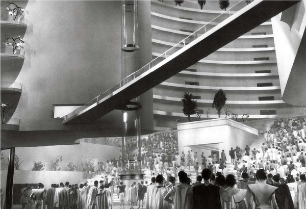 以此同时,为了远离实际,幻想艺术题材的小说与设计起头进入到片子内容傍边。1936 年的《科幻双故事片》(Things to Come)涉及到了将来本家儿义地下城市设计,制片人亚历山大·柯尔达据说最早邀请建筑学巨匠勒·柯布西耶来设计布景,被拒绝后才找到了孟席斯。