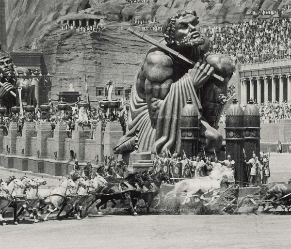 别的,西部片起头昂首,1952 年的《正午》、1953 年的《原野奇侠》、1956 年的《巨人传》奠基了西部片美术设计气概,但 1959 年的战争史诗片《宾虚》抢尽风头,不单影响了诸如《角斗士》、《指环王》等大片的创作基调,还斩获了次年的奥斯卡最佳艺术指导奖。