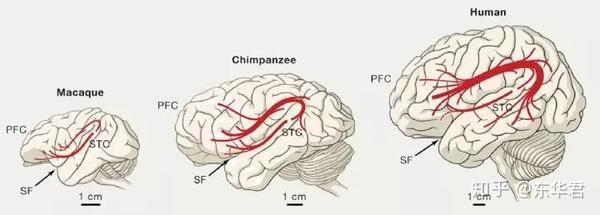 更为显著的是,在其他灵长类中,说话相关的神经回路——弓形束更不敷发财。在人类大脑中,弓形束延长到内侧和颞下回(图 5 右),而黑猩猩的弓形束只有一小部门延长到了颞下回(图 5 中)。在猕猴脑中,标的目的颞下回的投射似乎完全不存在(图 5 左)。这种布局上的渐变现象很可能暗示了说话的进化过程。详情请见:山公黑猩猩都有声带为什么不克不及教它们说人话。