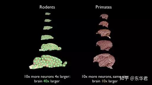 跟着演化的推进,啮齿类动物脑内神经元的巨细和数目在同步增添,这导致它们的大脑敏捷地膨胀。而对于灵长类而言,只有神经元数量在不竭增添,单个神经元的巨细转变并不大。这种方式很是经济有用,可以在大脑内塞入更多的神经元,而且缩短神经元之间的距离,加速信息在脑内的传递(详见下文)。分歧的大脑演化形式导致不异巨细的灵长类动物大脑比啮齿类动物大脑总有更多的神经元,而且大脑体积越大这种差别更较着。
