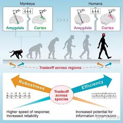 当然,这种鲁棒性和效率的差别在统一物种的分歧脑区之中也是存在的。这两个物种中,进化史上更早呈现(相对初级)的杏仁核(amygdala)中的旌旗灯号比进化史上最晚呈现(相对高级)的大脑皮层(cortex)中的旌旗灯号更具鲁棒性,可是大脑皮层更有用率。这也是合适生物进化纪律的:大脑旌旗灯号的鲁棒性越强,旌旗灯号就越清楚不变。好比,在危险下杏仁核可以明白的发出“快跑!”旌旗灯号;可是在更复杂的情况下,简单粗暴的决议计划则更轻易犯错。灵长类动物进化出了加倍矫捷的脑区——皮层,可以让我们综合更多的信息、进行更大的运算,进而做出加倍合理的决议计划。这种脑区和物种间的交叉差别,或许能部门诠释人类智能发生的原因。