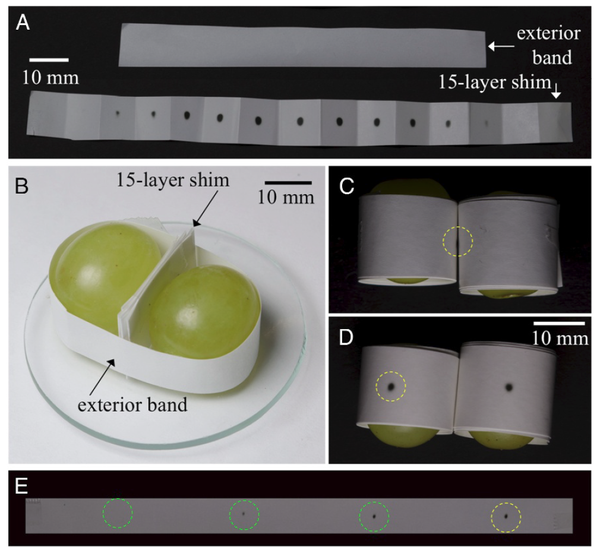 这是在两个葡萄中心放上 15 层的纸的成果,可以看到中心的灼烧陈迹较着,两侧依次递减,从而申明这一现象并不是葡萄发烧导致,而是电磁场中中心区域电离所致,现实上,葡萄被加热达到的温度距离电离所需的温度(万摄氏度及以上)还差的很远。