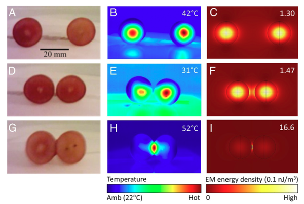 这是热当作像和电磁场能量密度分布,后者是经由过程 FEM 仿真获得的。可以看到,若是两个葡萄距离比力远,微波在葡萄中心形当作驻波,葡萄中心的电磁场密度最高,温度也最高,若是两者距离很近,电磁场则集平分布在两个葡萄中心。
