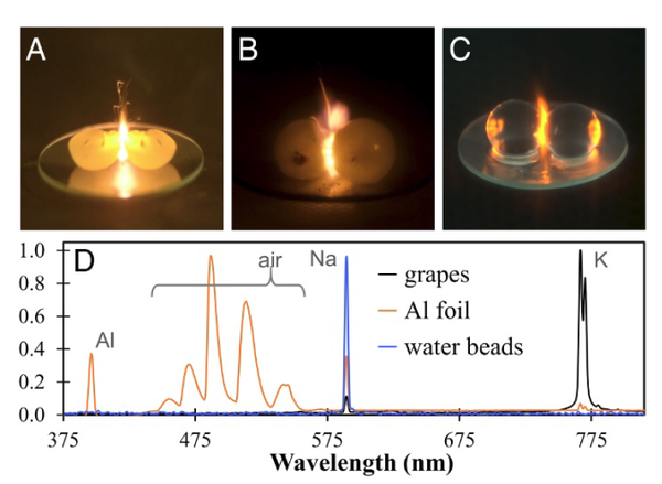 下图是葡萄和水球的光谱,可以看到钠和钾的特征线,表白发光的元素本家儿如果葡萄中的钠和钾或者水球中的钠(水中含有 NaCl)。