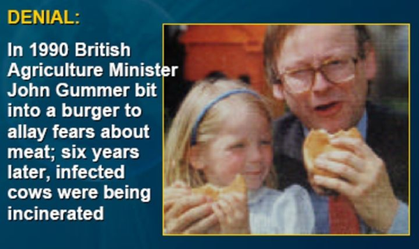 题图里的英国农业部长在 1990 年说肉是没问题的,可问题是 6 年之后这类肉都是禁止出售、并焚化处置的。